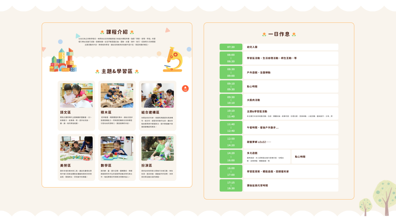 以圖文並茂的方式呈現課程內容,清楚展示教學特色與學習方向,並規劃一日作息表,協助家長了解孩子在園所的日常生活與學習安排。