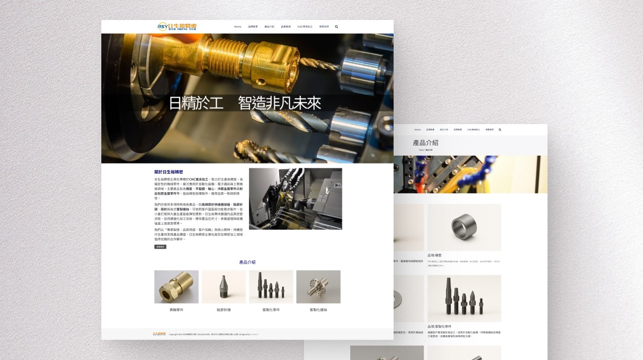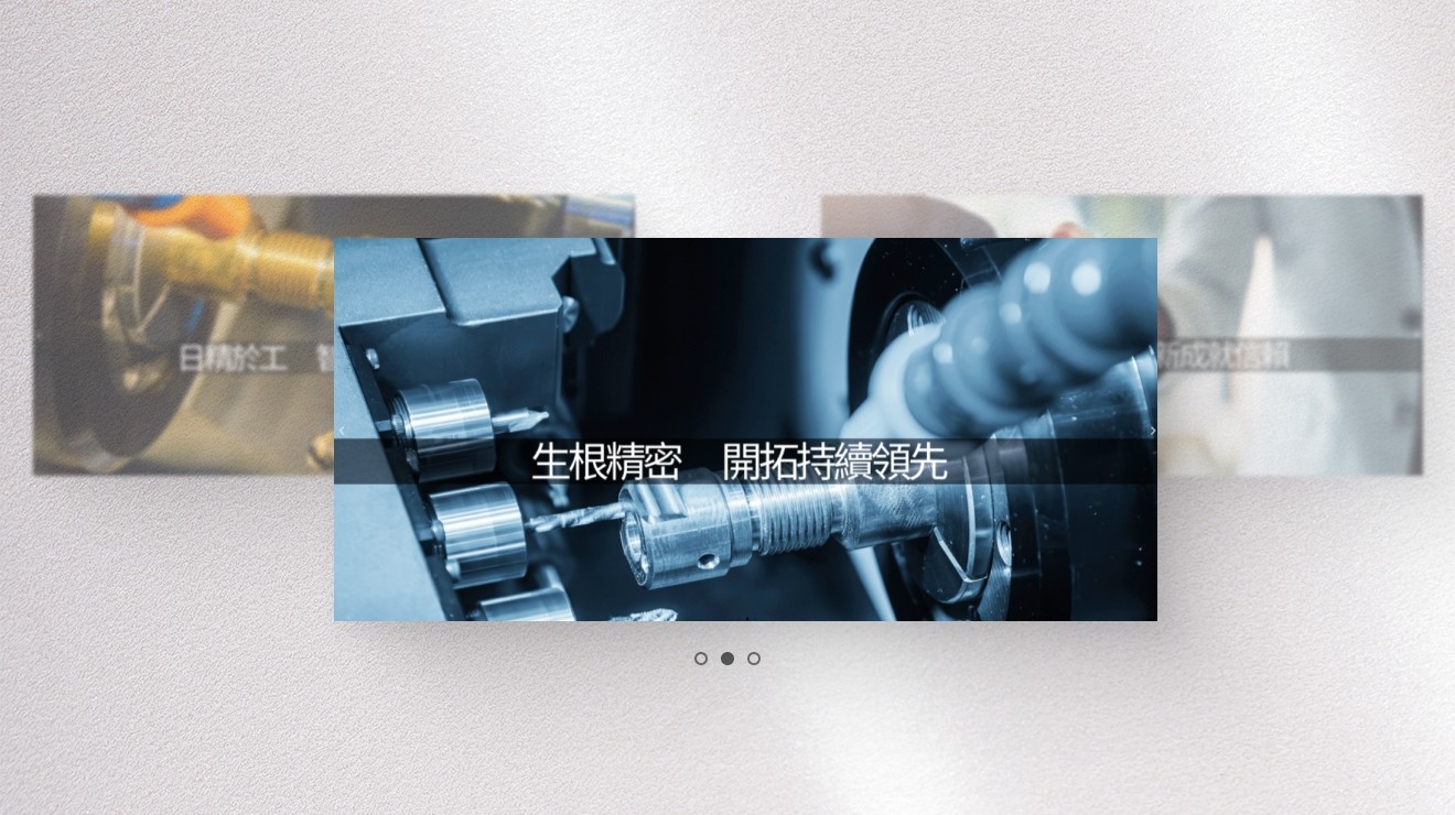 首頁 banner 使用高解析度 CNC 加工照片,並疊加具質感的標語(如「日精於工 智造非凡未來」),營造高端製造業氛圍。使用滑動輪播圖功能(Slider),可展示多張代表性影像,增加吸睛度。