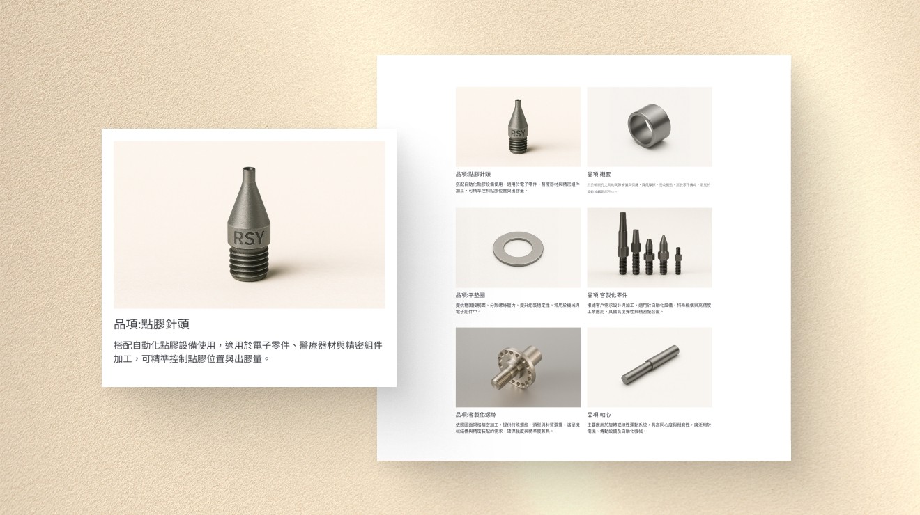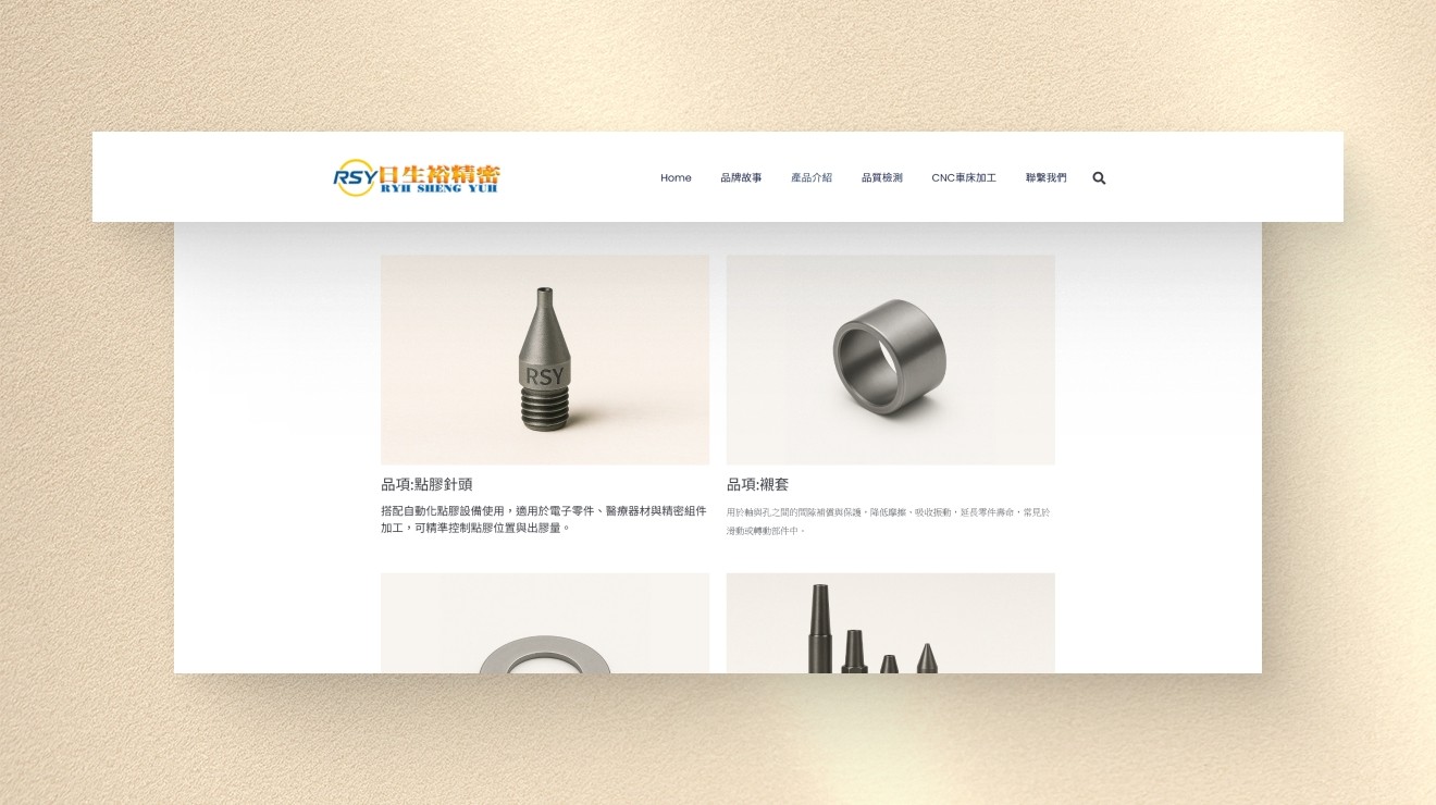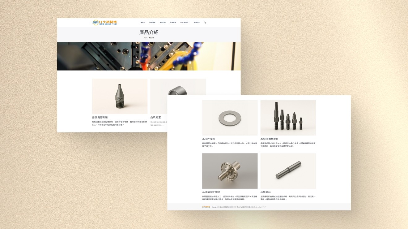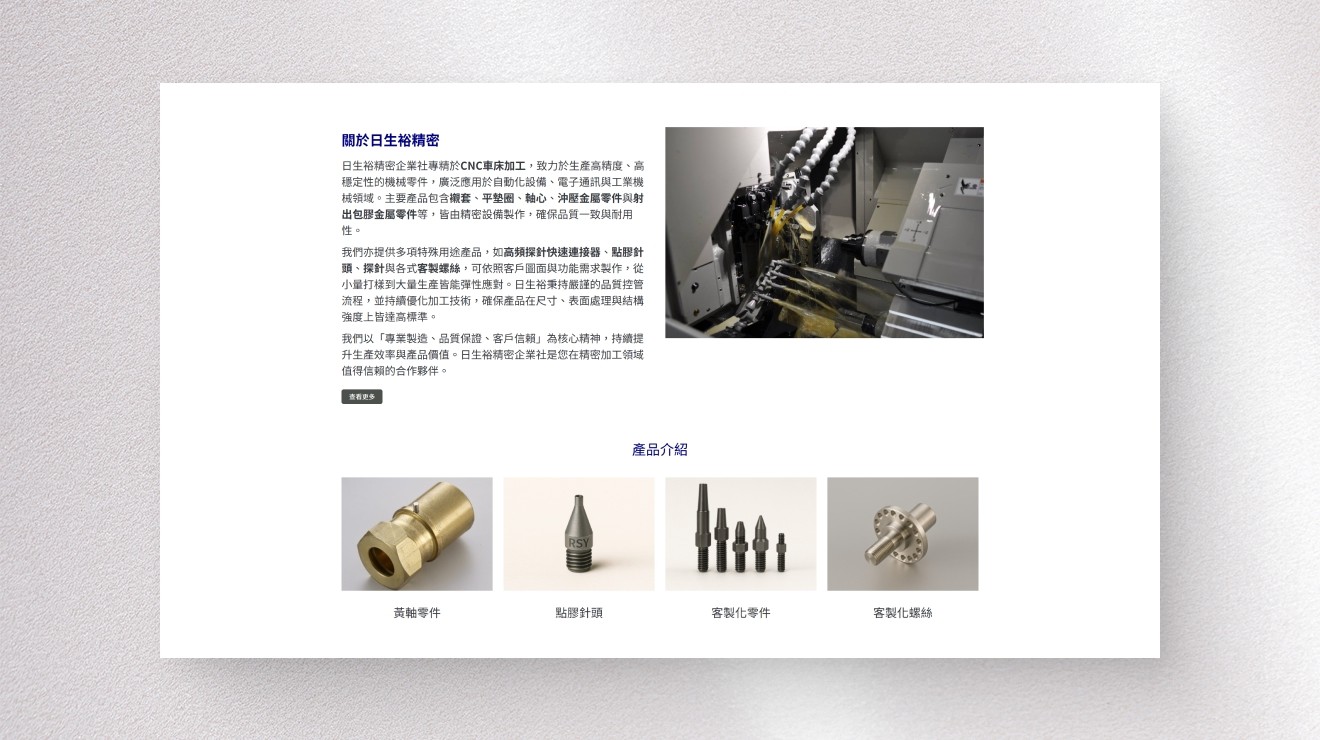 明確標示「產品介紹」,搭配半透明背景與機台實景圖,加強加工技術氛圍感。產品分類展示 採 兩欄式排版,整齊排列六大產品項目,每項搭配實拍圖與說明文字,提升專業度與 SEO 成效。