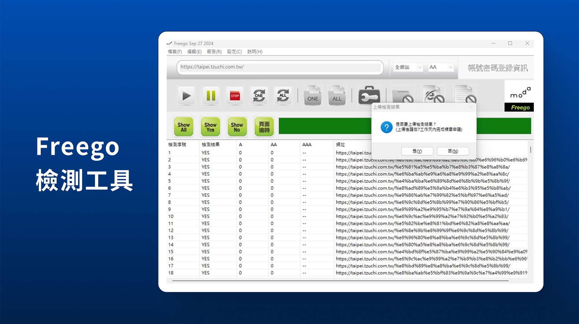 ➋Freego檢測工具,依 WCAG 2.x 準則檢測 A/AA/AAA 級的「能機器判斷」項目(如對比、替代文字、表單關聯、語義結構等)。