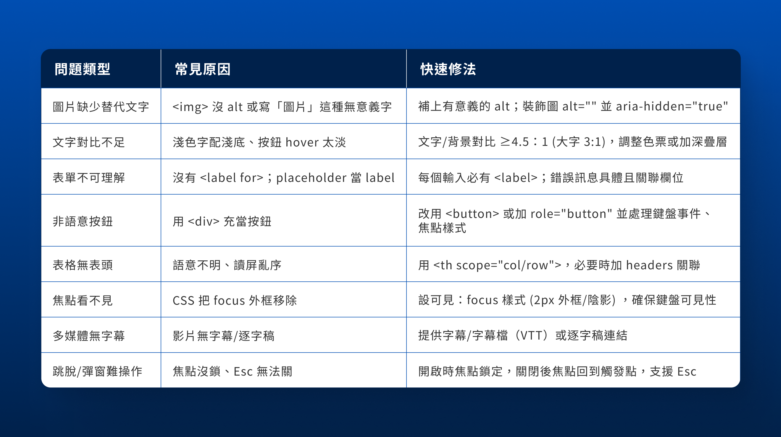 ➊對比/色彩:文字與背景對比 ≥ 4.5:1;按鈕/連結 hover 與 focus 有可見狀態;用 Design Token 管控色階。