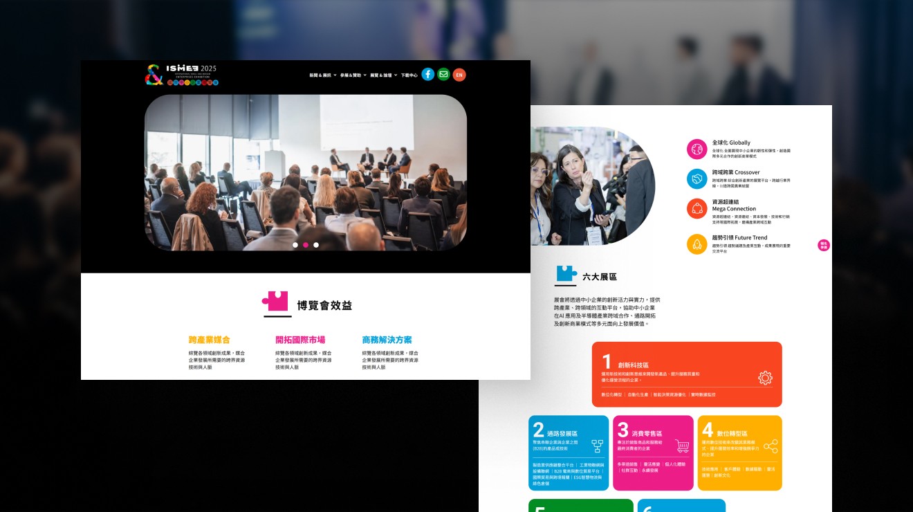 ➋首頁大圖與視覺動線清楚,首頁上方使用全螢幕橫幅 Banner 搭配大型主題標語,視覺吸睛。使用者可快速理解展會主題、年份與參展訴求。