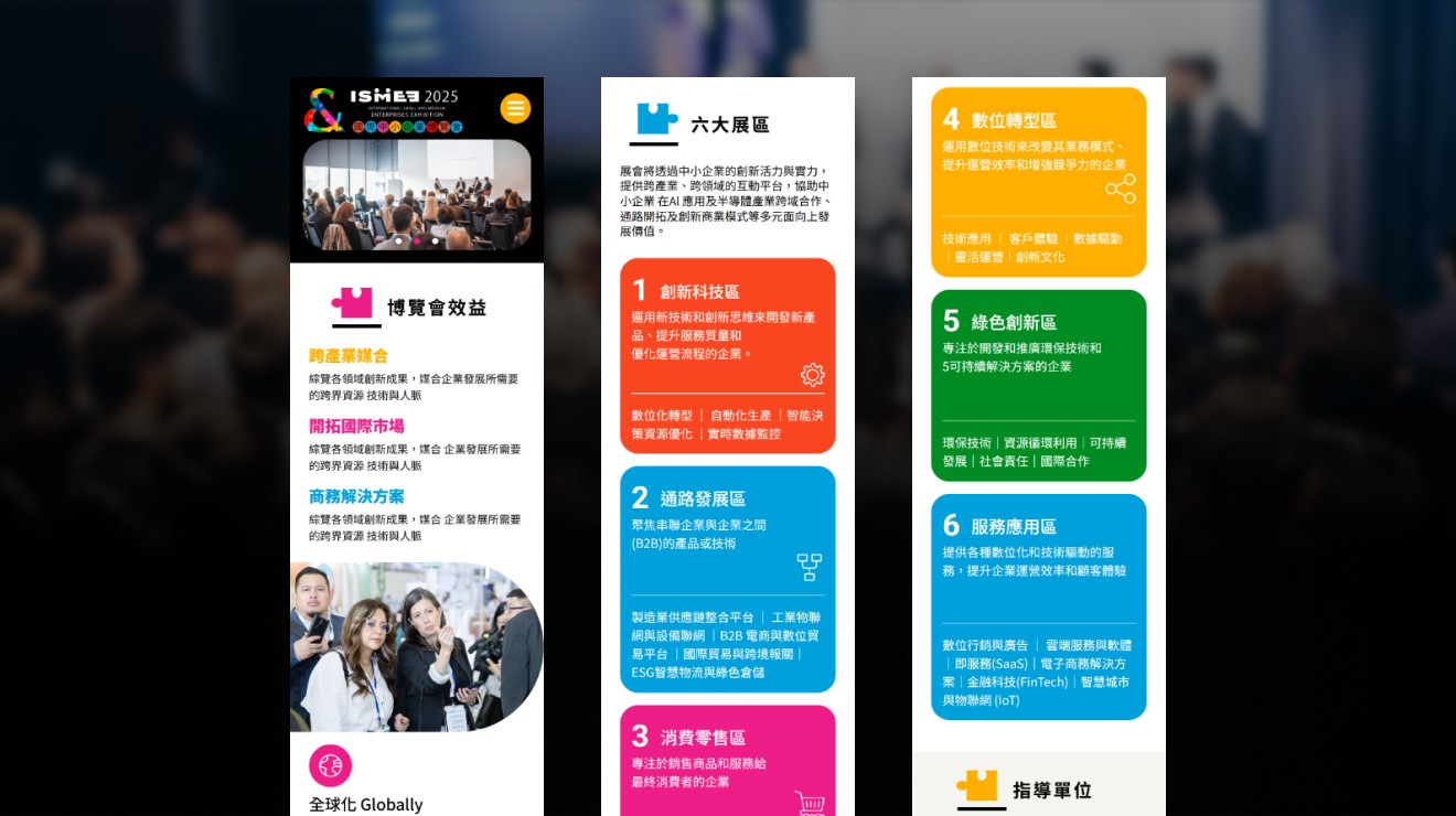 ➌模組化區塊清楚,網站排版採「模組式分區」呈現:最新消息、展區介紹、報名資訊、贊助單位等,導覽清晰,邏輯清楚。每個區塊內搭配簡短文字+按鈕導引,鼓勵點擊進一步瀏覽。