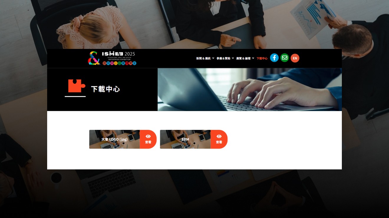 【下載中心】提供 LOGO、主視覺、EDM 等設計素材,方便參展商或媒體使用。每份素材皆附簡易說明與下載按鈕,介面整潔、易於操作。資源分為靜態圖片、PDF、壓縮檔等多種格式,滿足不同使用需求。