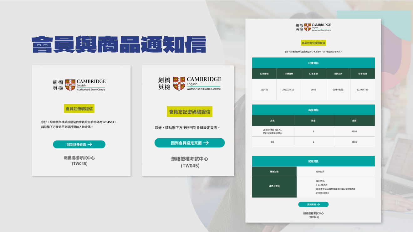 劍橋英檢以專業的檢定服務提供使用者專業的英文檢定報名與英文教材相關商品購物。樂活以穩重專業清新的方式整理考試報名資訊,提供完整流暢的考試報名與會員功能。 報名英文檢定場次,金物流與電子發票發送結帳,考試結束後的成績查詢及證書發送等狀態流程管理,後台針對個數據的報表統計,以及各部門角色權限管理與通知系統,最後在資安部分落實零中高風險等。