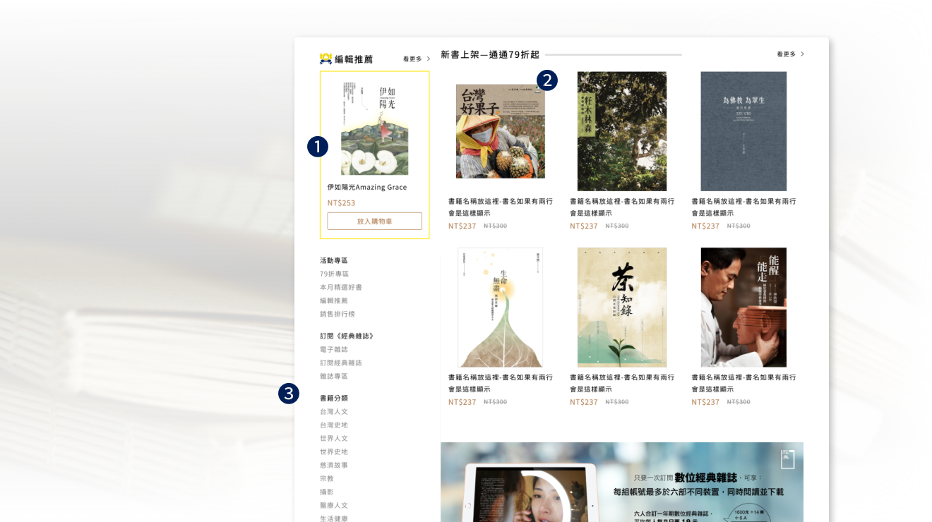 ❷ 除了一般Banner的Slider表現,我們在下方也安排一個無論是次要的推廣書籍、或是合作廠商的曝光都是一個很好運用的版位。
