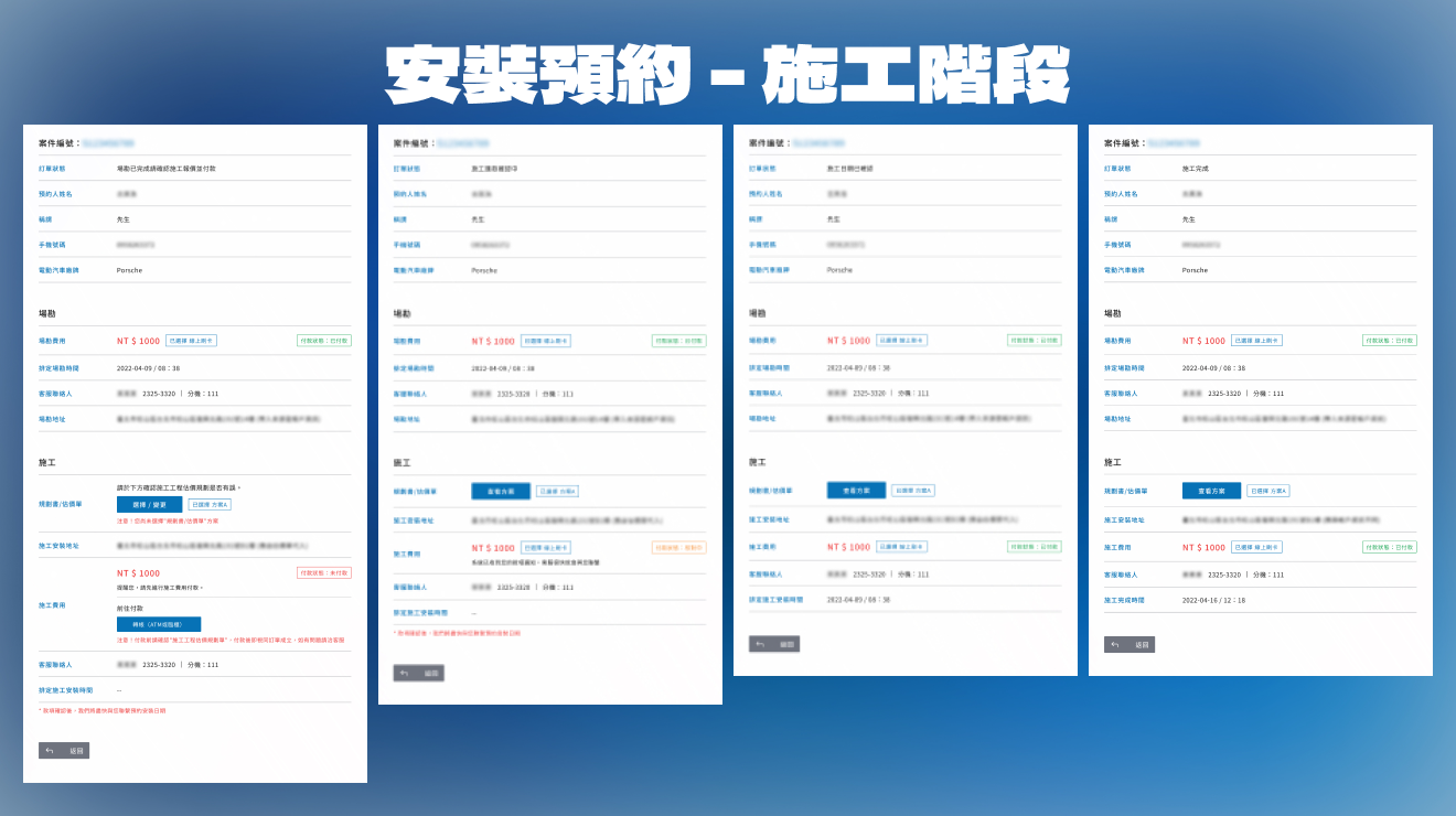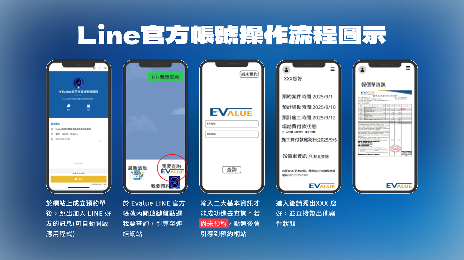 ➊預約網站預約成功後加入LINE好友訊息→對話框有小鍵盤可以點選我要查詢;或是最新活動、我要預約,點選我要查詢引導至連結網站,點選我要預約連結至預約網站→輸入正確案件編號、電話、姓名,即可查詢想要的狀態、預約時間、報價單等等。若有尚未預約的客戶點至這網站,右上角會有圖示點選後連結至家充預約網站。