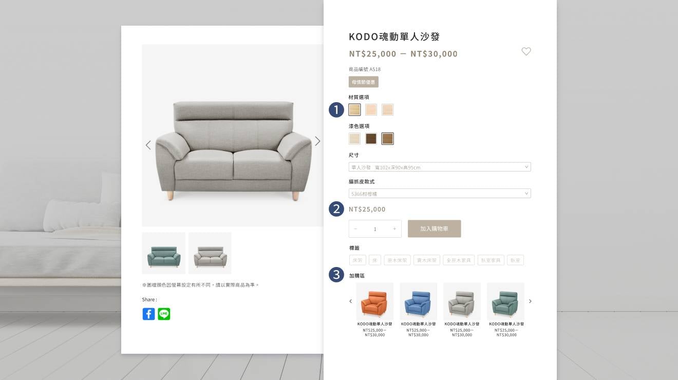 描述、規格、材質、客製等資訊頁籤,可為各別商品提供有價值的資訊,建立顧客對於商品的信任。