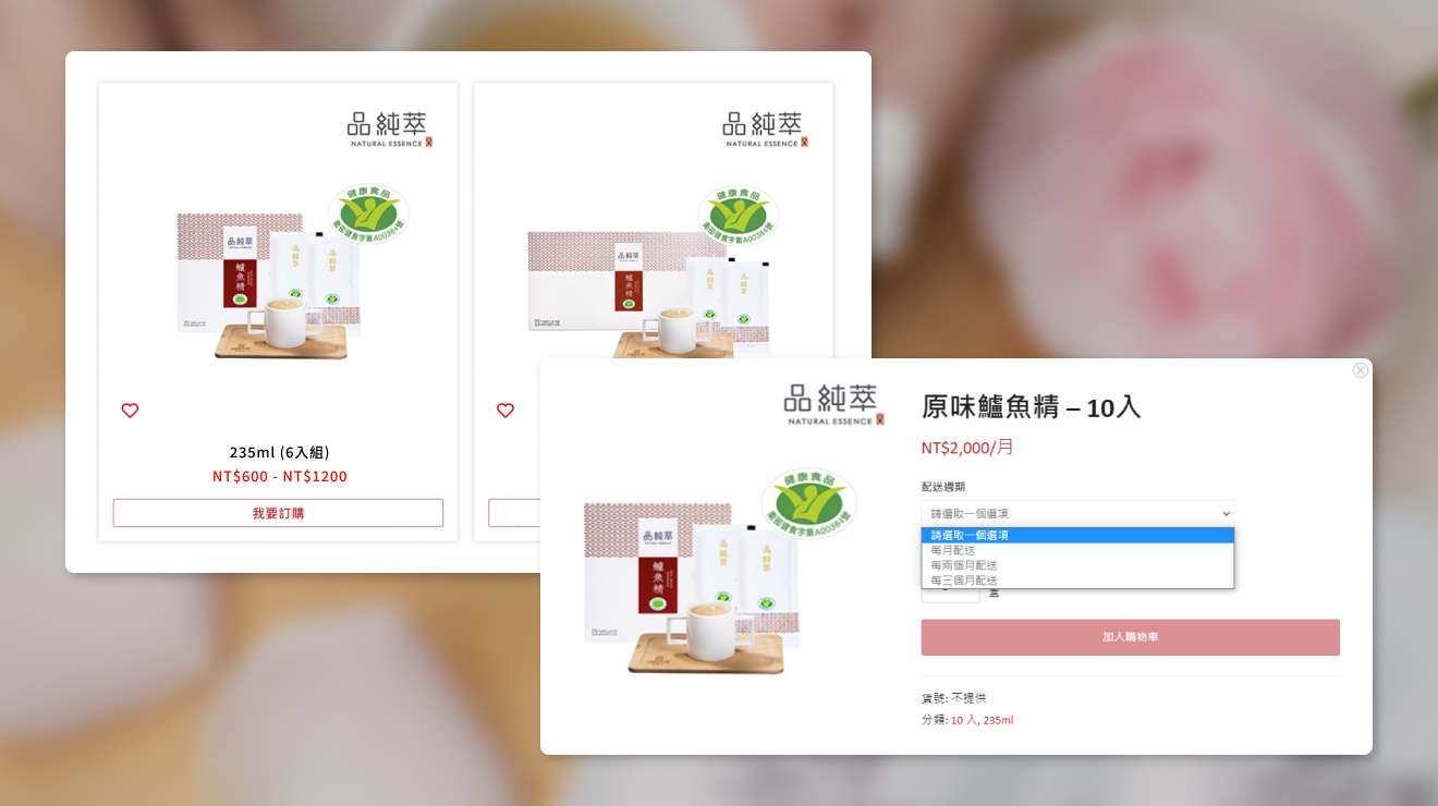 品純萃的商品為高單價,富含營養價值的保養食品,所以不建議消費者每週食用。我們以此條件下替品純萃開發出能夠每月、每兩月至每三個月配送的服務,讓消費者依照自己喜好及身體需求去選擇配送週期。